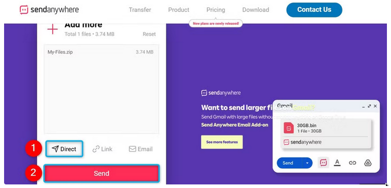 파일을 추가한 후, 피어투피어 방식으로 공유하려면 "직접(Direct)"을 클릭합니다. 그런 다음 "Send"를 선택합니다.